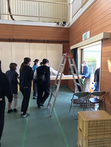 シートを敷き終わり、ガランとした会場に、いすを並べ始めます。